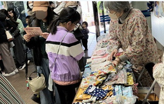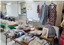 手作りのエプロン、ふきん、袋、おもちゃなどなど力作ぞろい。中古や新品の日用品や衣類も出ました。